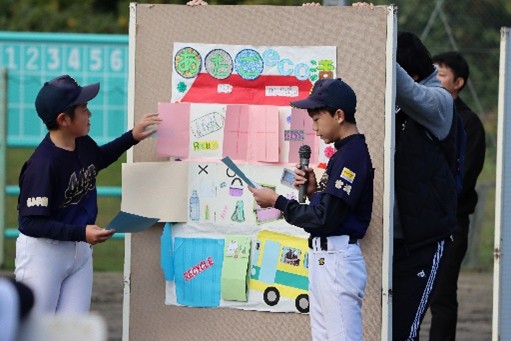 併催イベントとして「環境活動コンテスト」を実施し、日頃より各チームが取り組んでいるエコ活動について、模造紙にまとめ、開会式にて発表していただきました。どのチームも環境意識が高く、審査は大変難航しました。