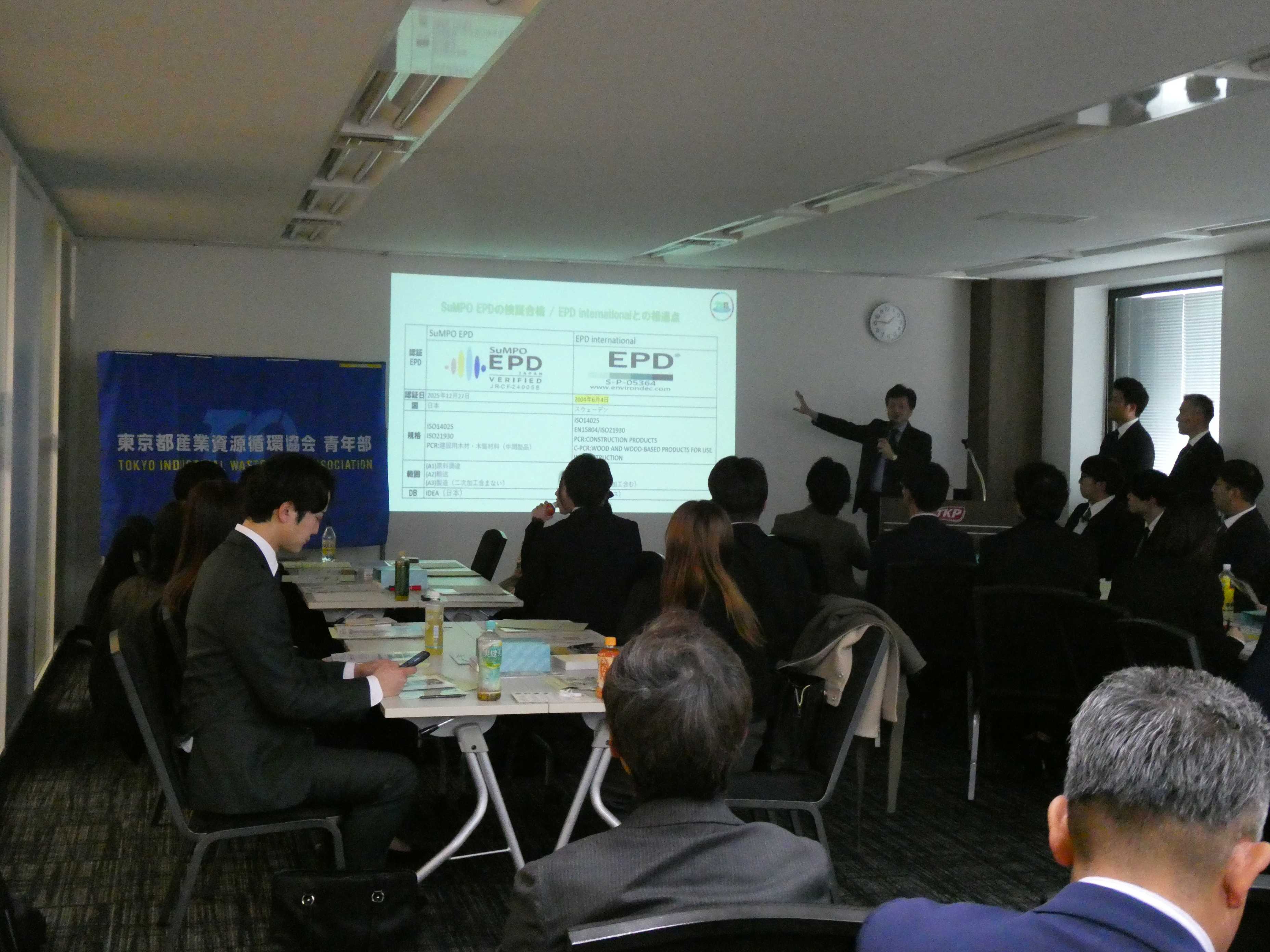 成果:前半では、青年部OBとして現在も業界を牽引する各社代表3名より、廃木材100%使用のパーティクルボード製造、微生物技術を活用したアップサイクル製品開発、高度選別処理および人工軽量土壌の製造など、実践的な脱炭素・資源循環の取り組みをご紹介いただきました。また、東京都の環境・資源循環行政に長年携わってきた当協会専務理事より、制度設計と現場実務双方の視点から講演を行い、政策と実務の接点に加え、行政における意思決定や制度形成の背景についても理解を深めました。