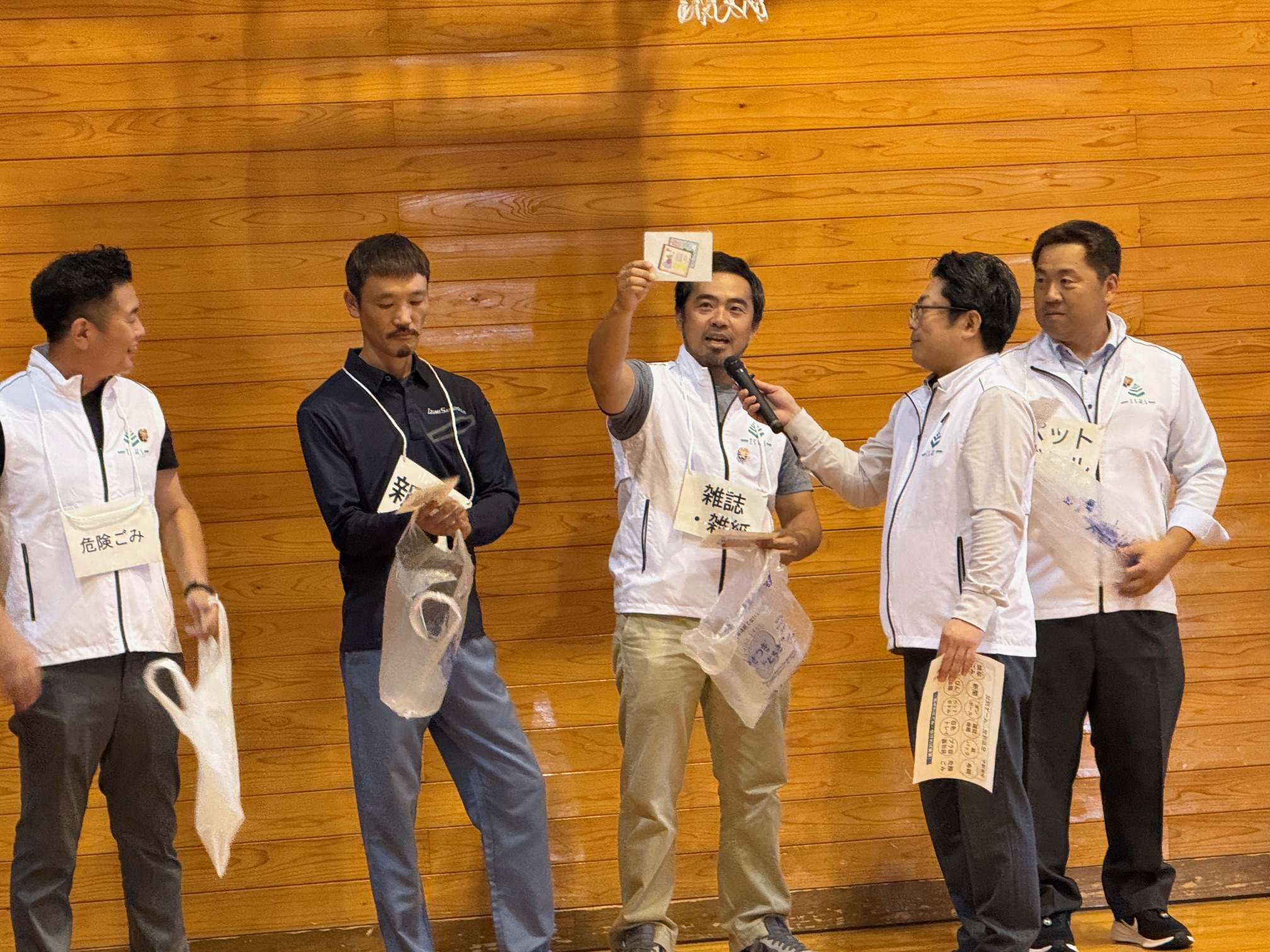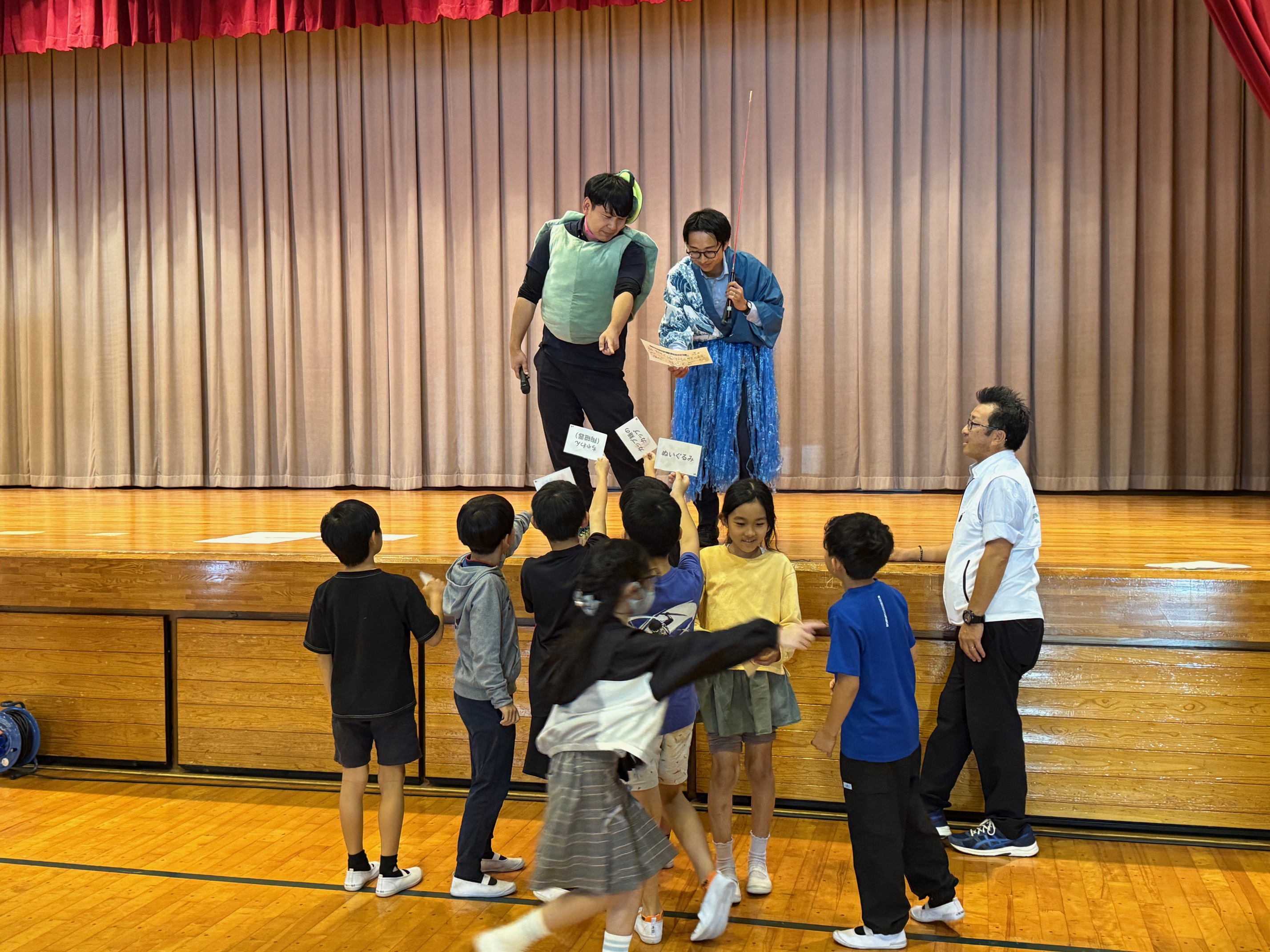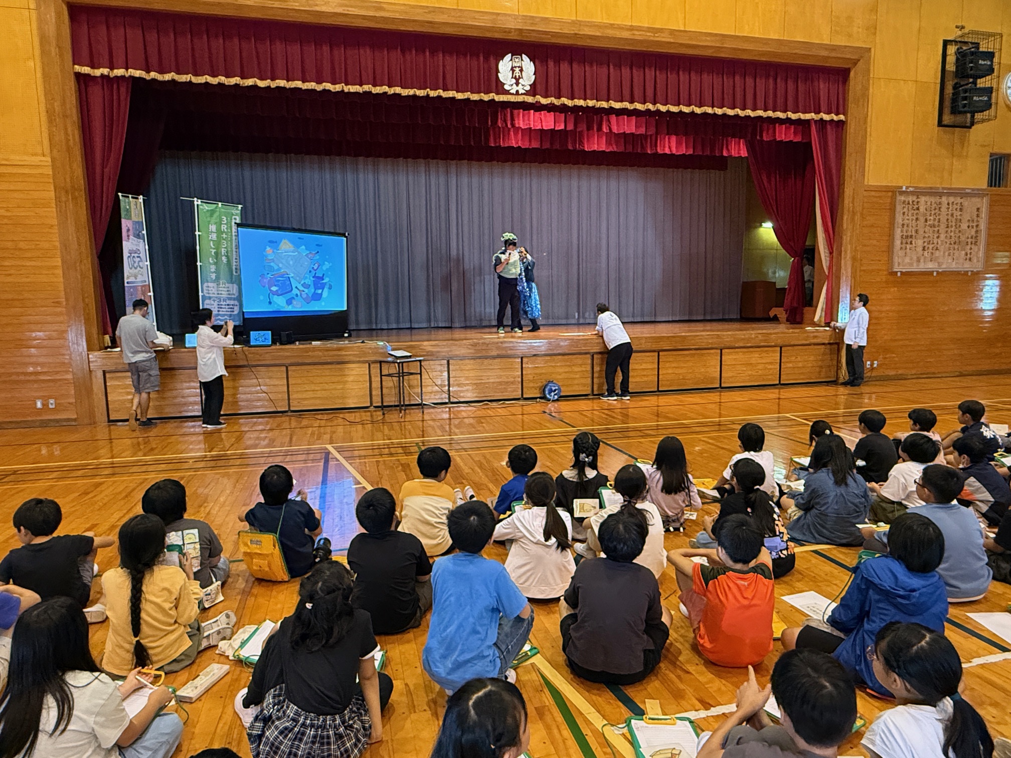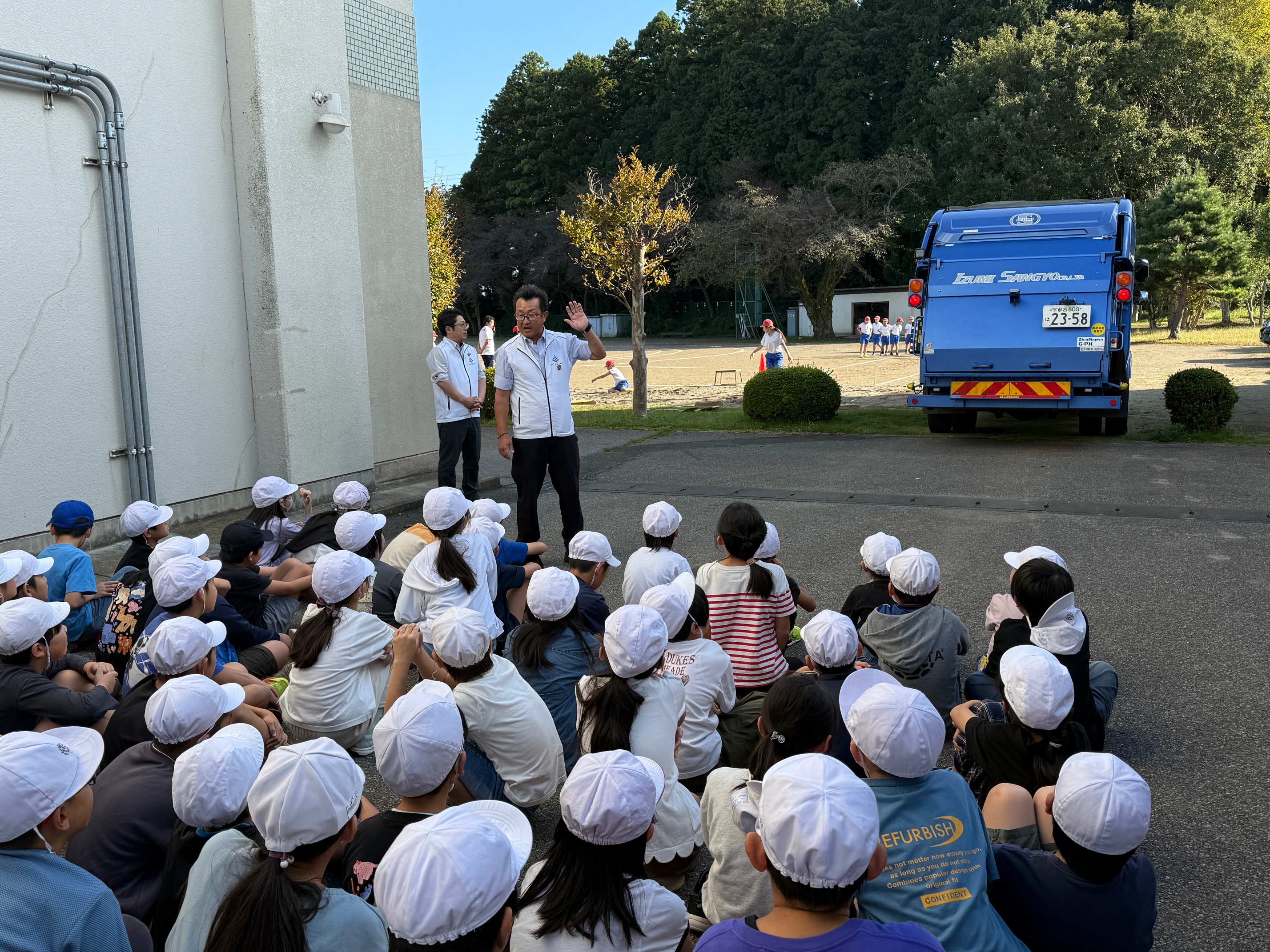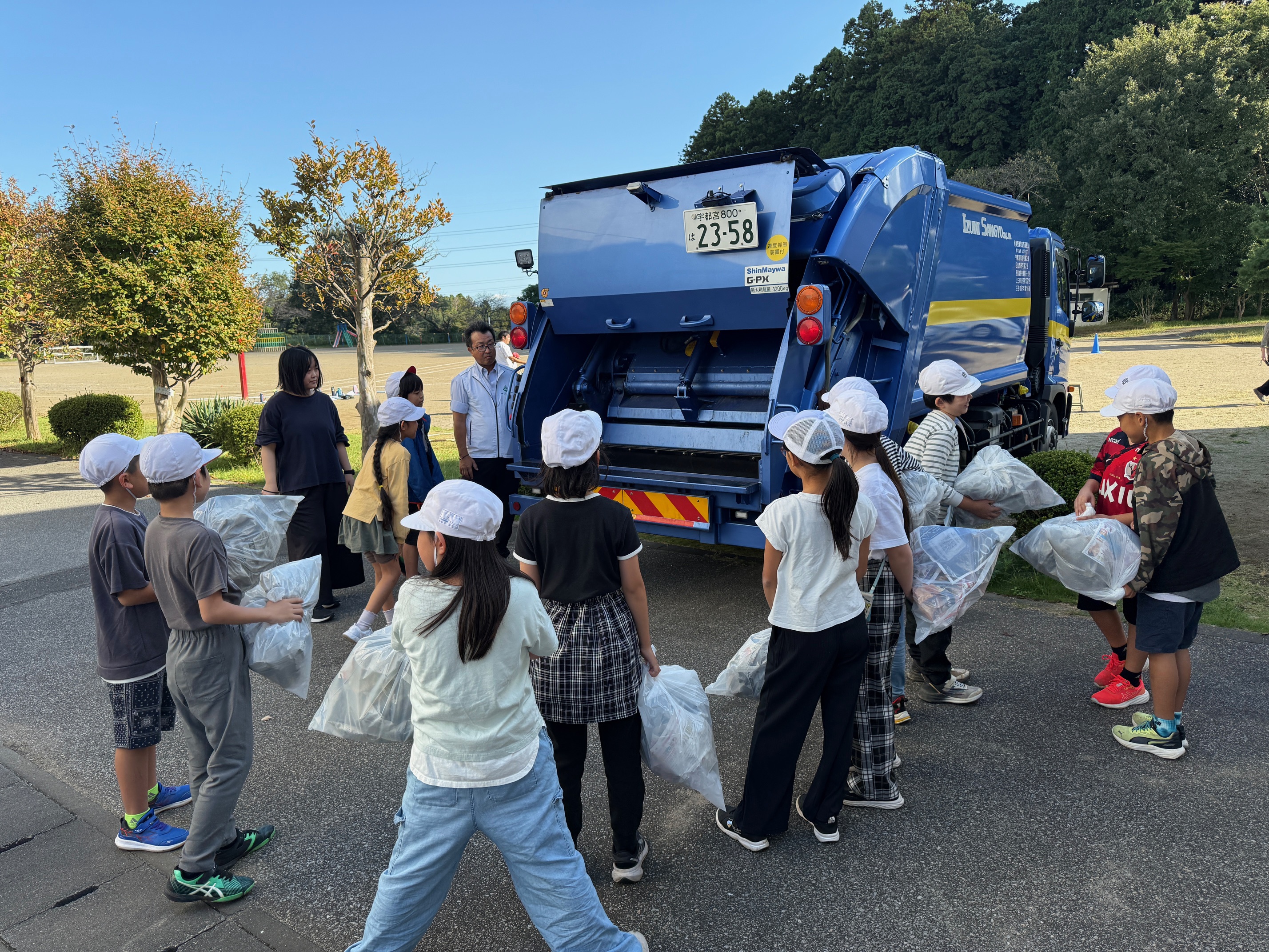 今回も体育館で寸劇「プラスチ郎」を上演し、校庭ではパッカー車を用いて、ごみ収集の仕組みを説明するとともに、児童がごみ投入と圧縮の様子を体験しました。