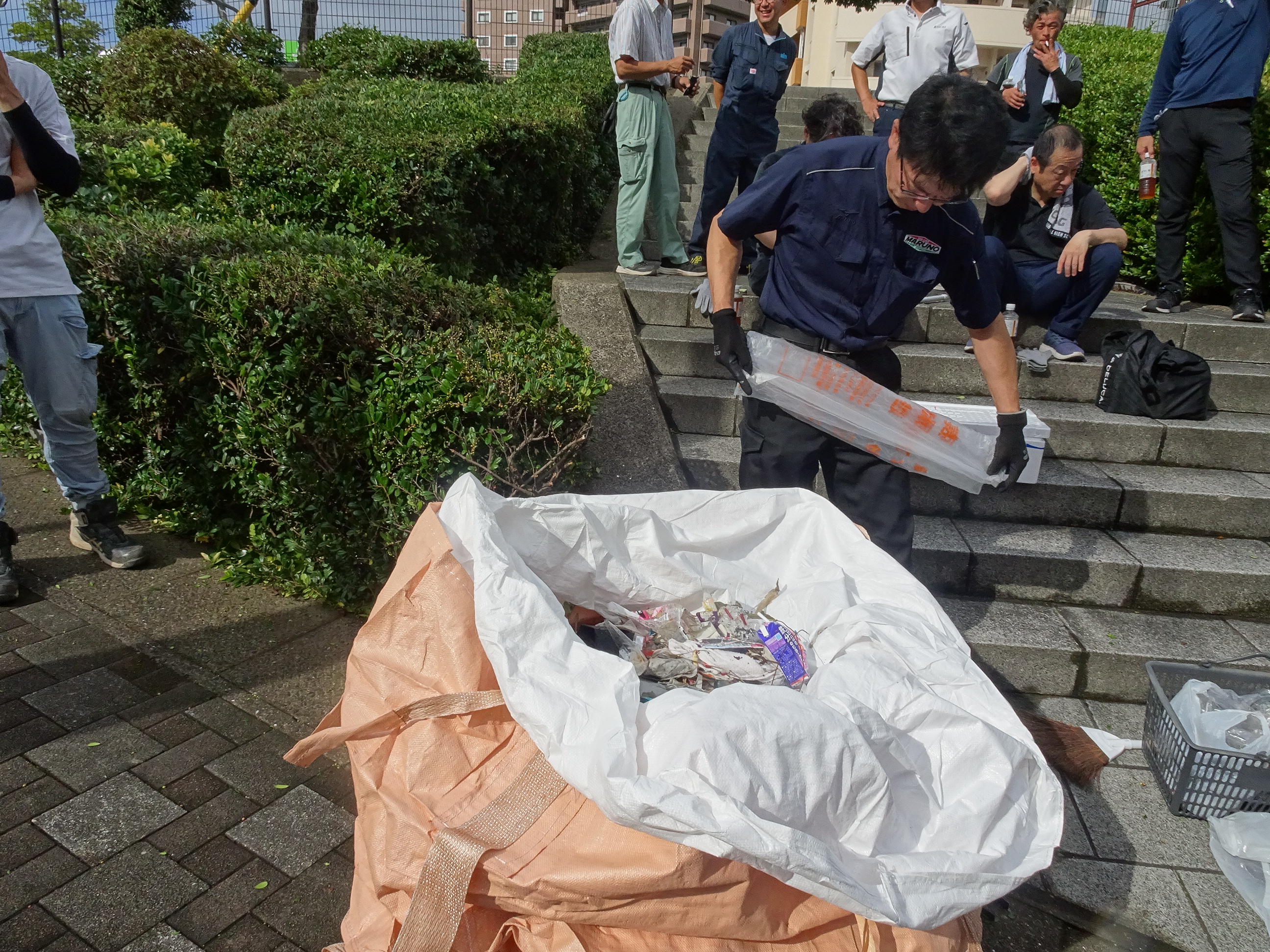 ごみ袋、火ばさみ、軍手、ほうき、塵取り、草刈り機、お茶、デジカメ