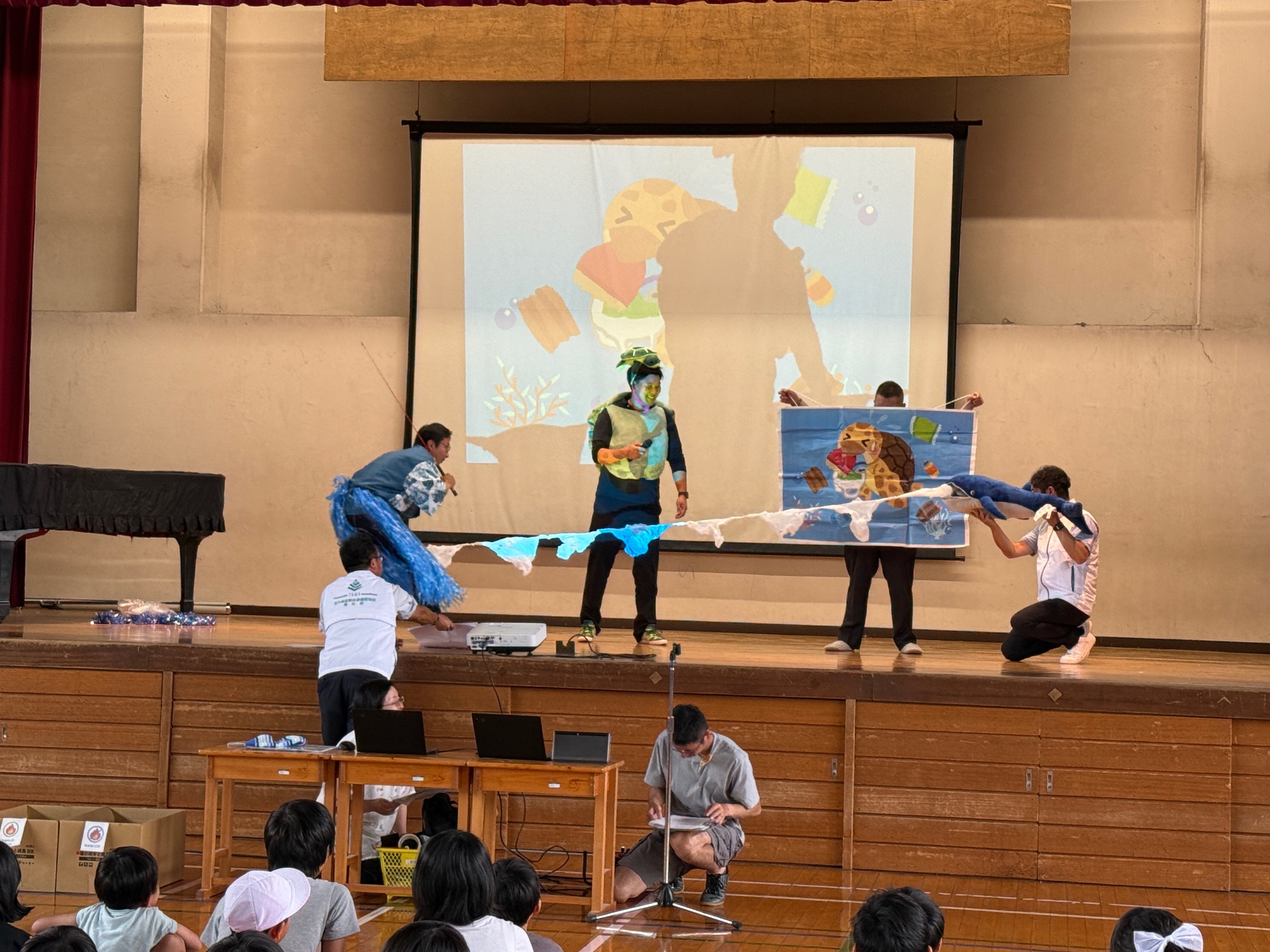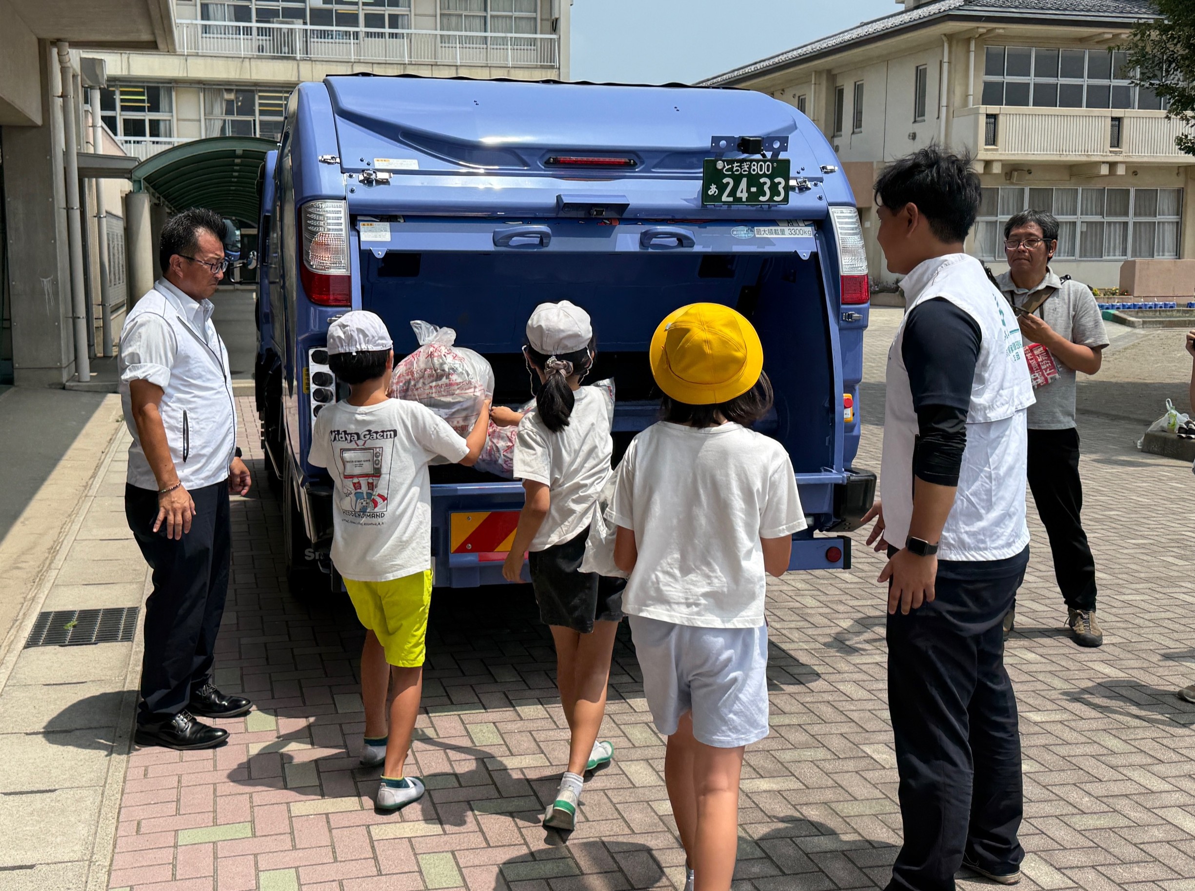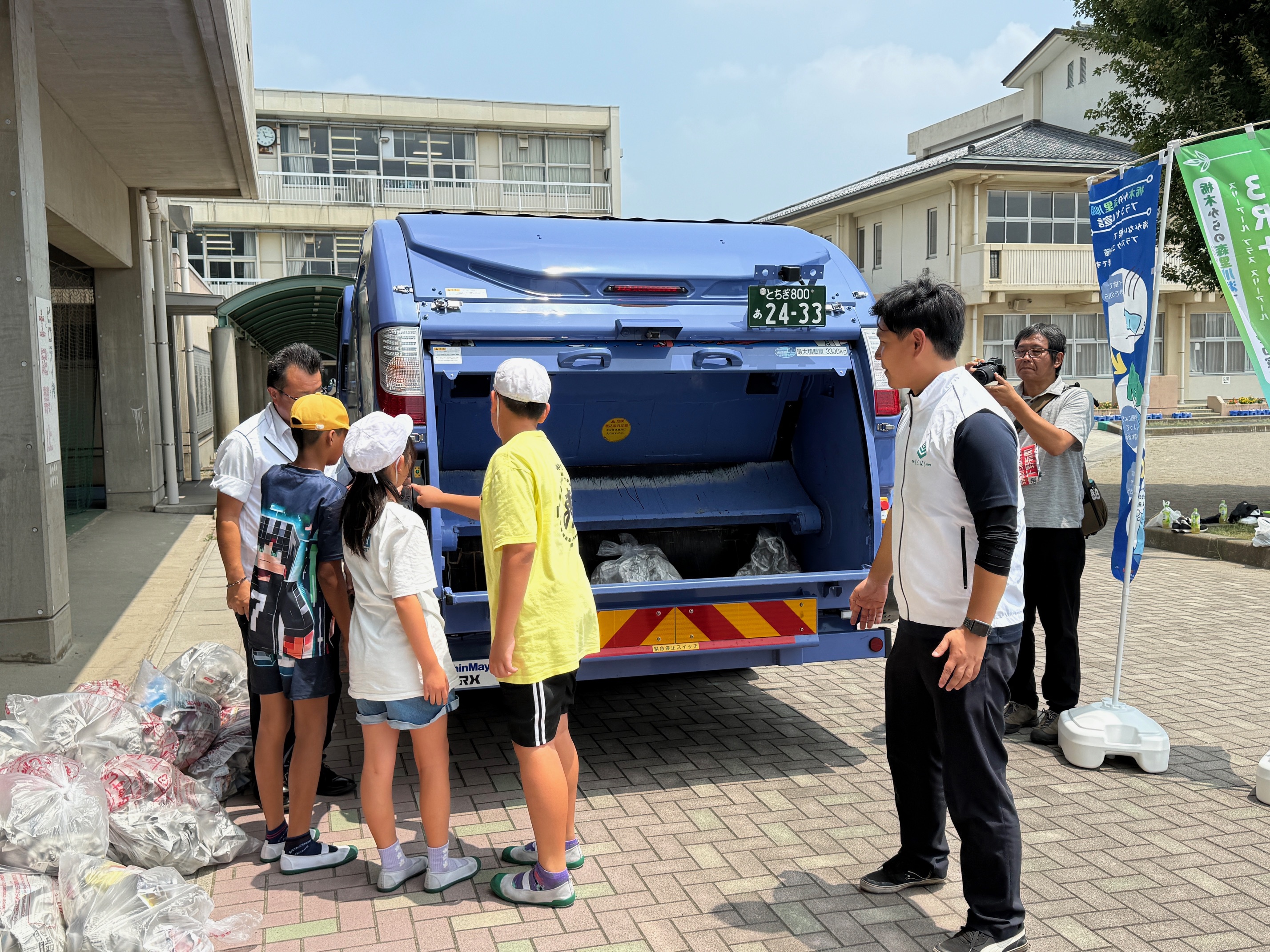 先ず体育館で、浦島太郎をモチーフにした寸劇「プラスチ郎」を上演し、分かりやすくごみ問題への理解を深めました。続いて校庭では、パッカー車(ごみ収集車)を使用し、ごみ収集の仕組みや仕事について実物を見ながら説明を行い、児童が実際にごみを投入して圧縮される様子を体験しました。